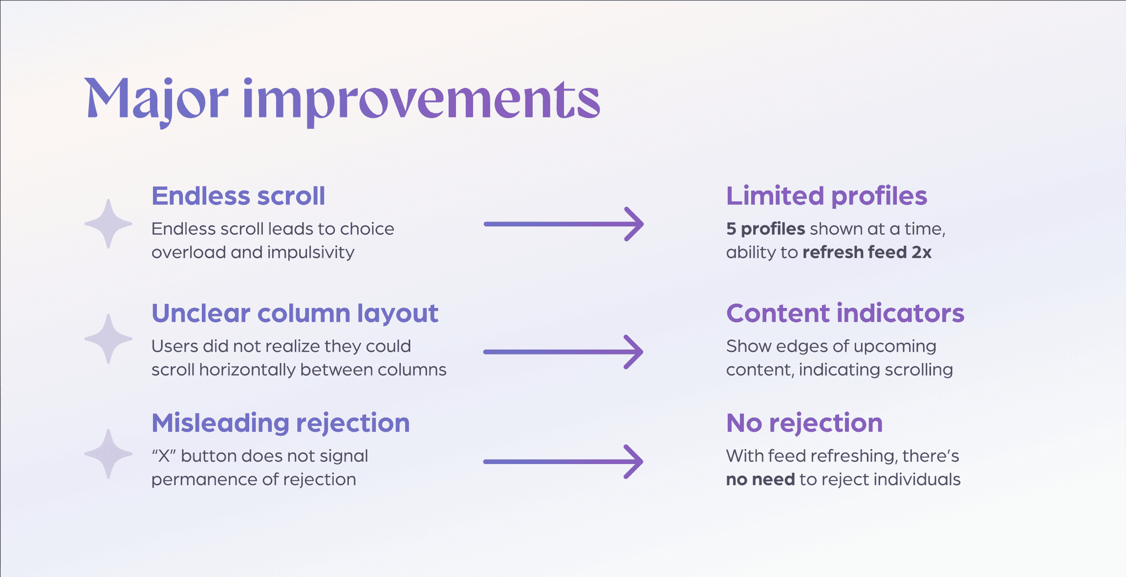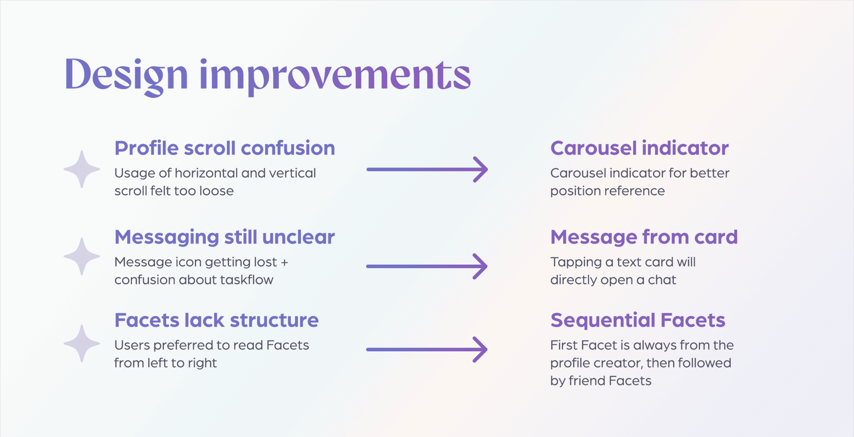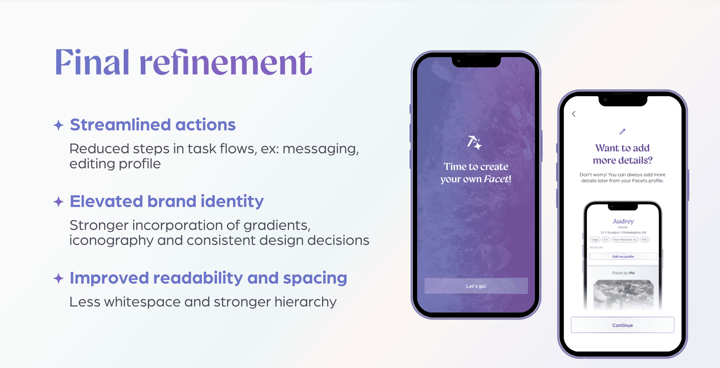 We used this opportunity to refine key features and terminology, ensuring clarity in how we help our audience start dating with dimension. This process led us to solidify our core features and clearly define what a "Facet" represents.