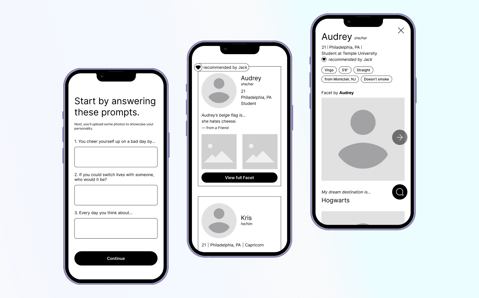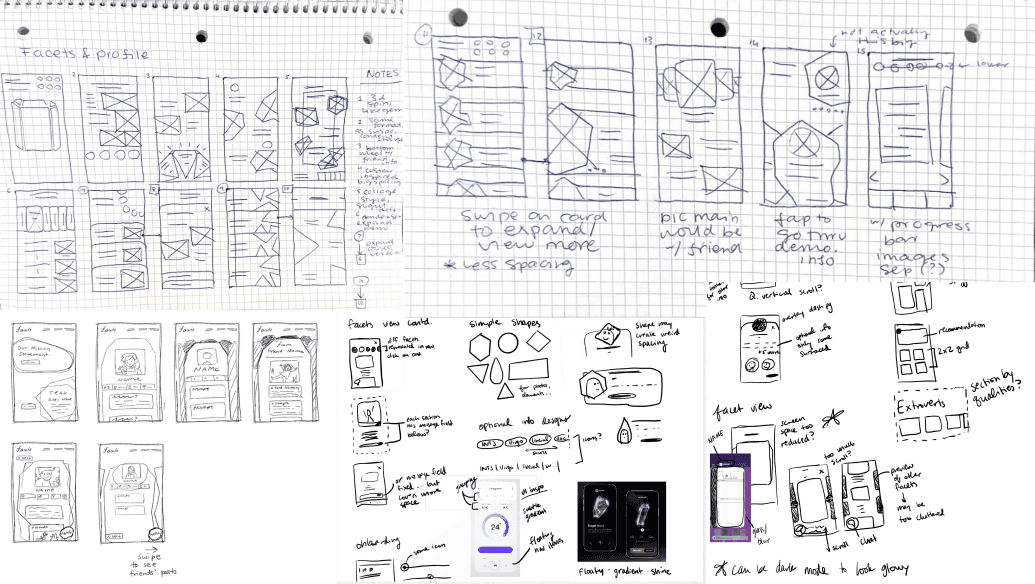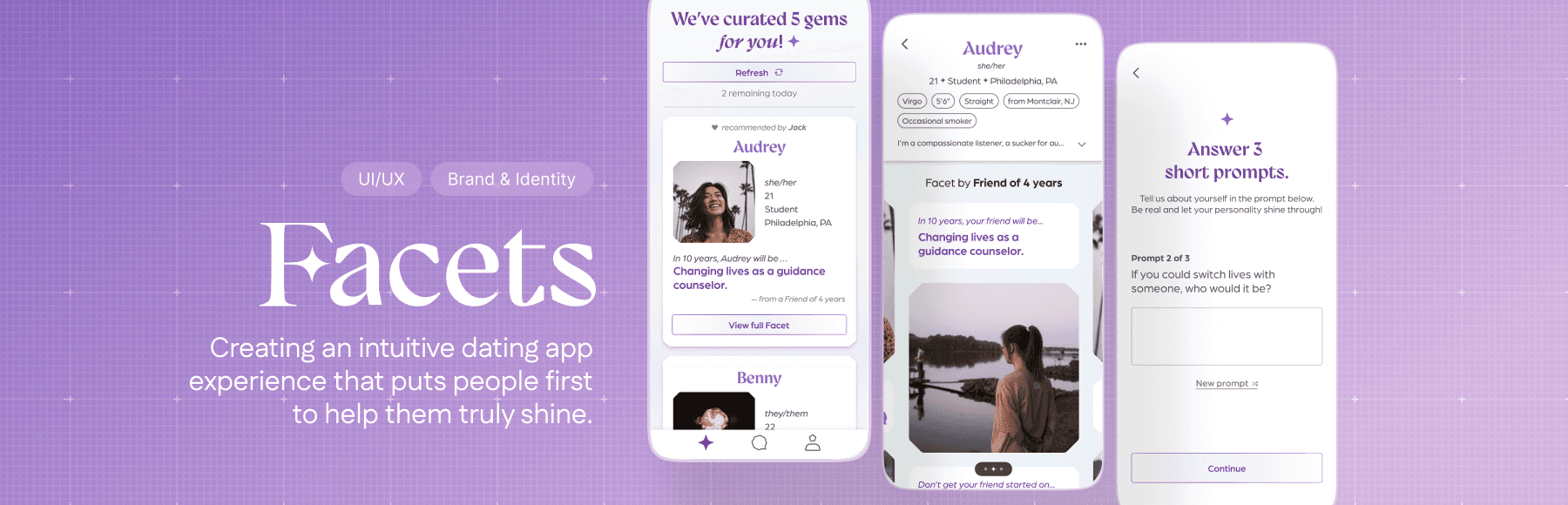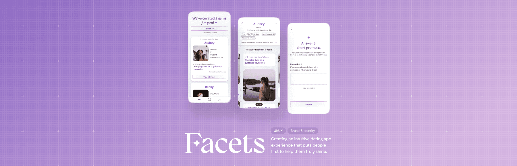 As we refined Facets’ tone and feel, I designed a logo to reflect its identity. The elegant typography and 4-point star detail symbolize the many facets of personality and connection in dating. The 4-point start became a key icon throughout our UI, reinforcing the brand and unifying the visual experience.