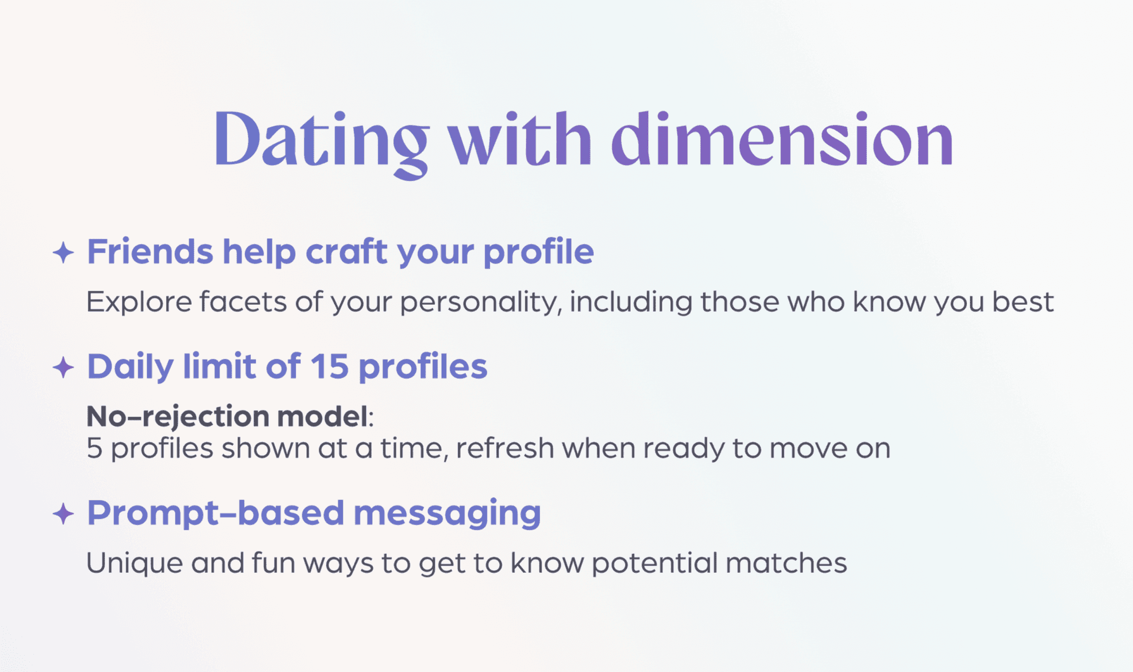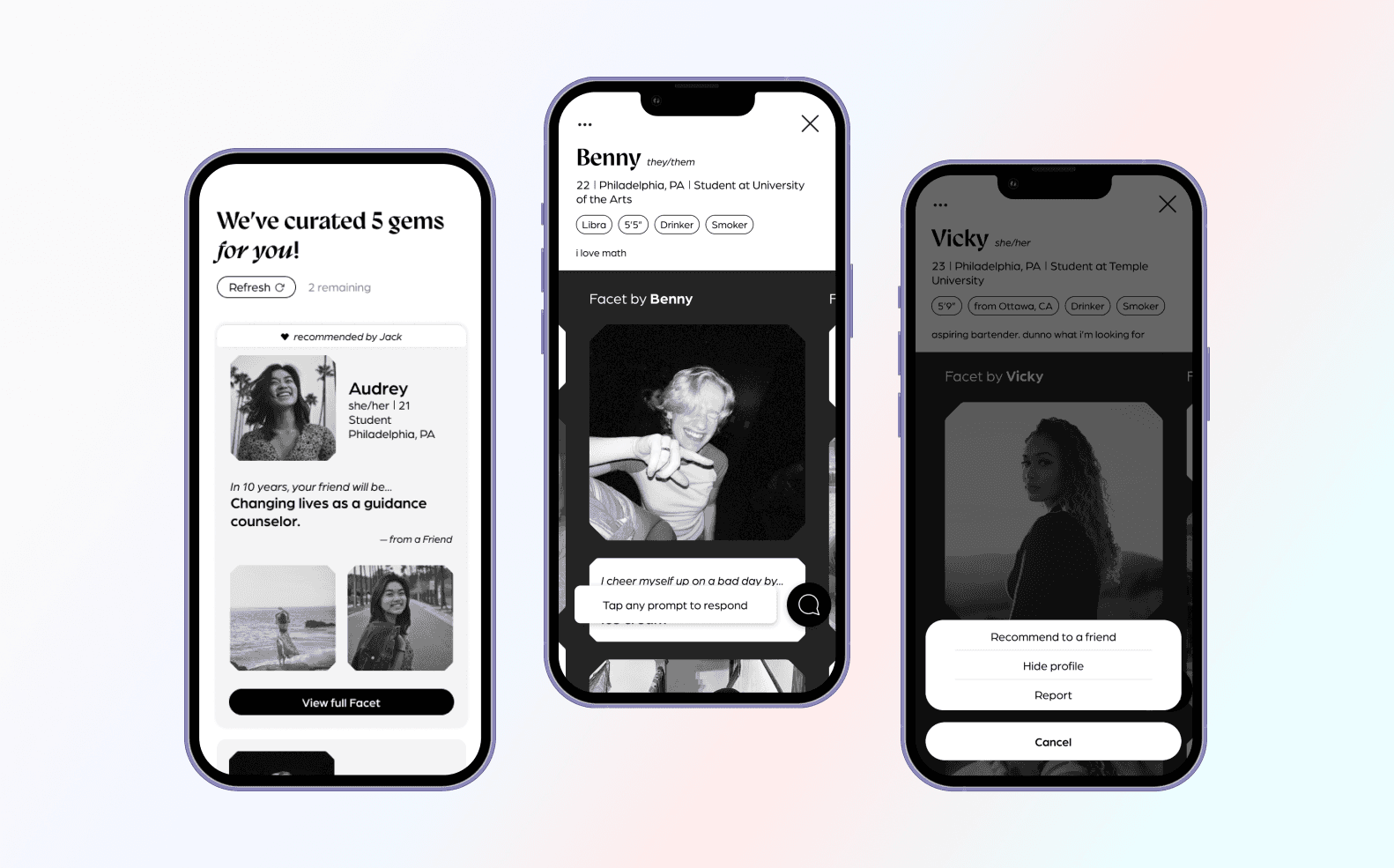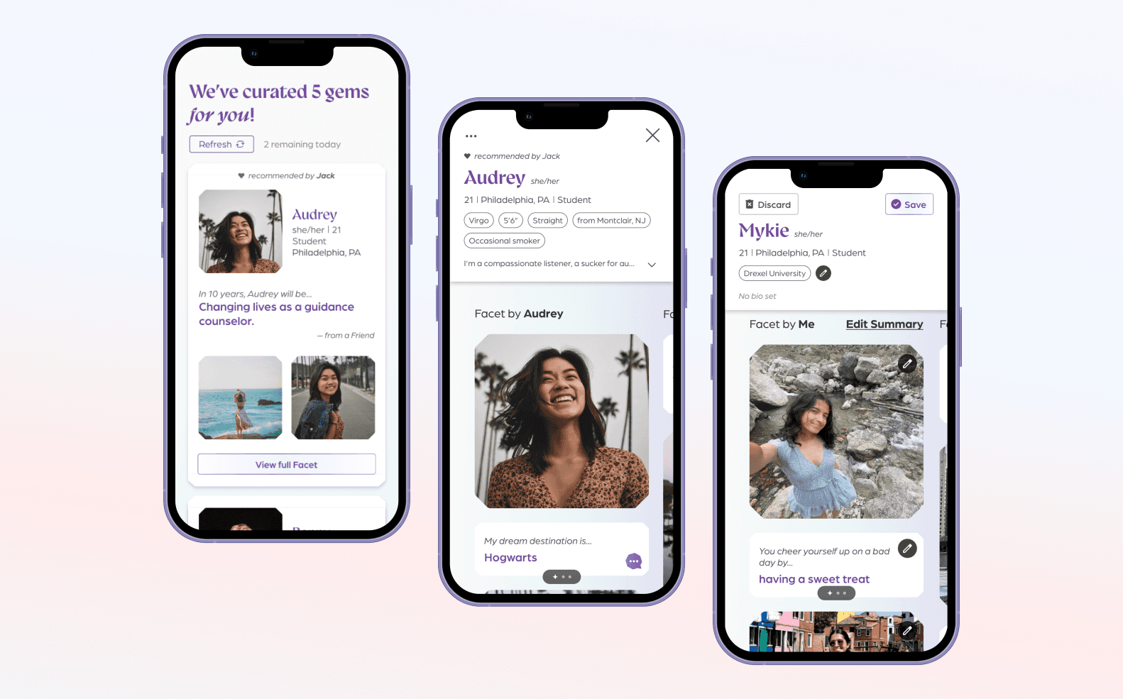Facets is a dating app that showcases multifaceted profiles, built with help from friends, and displayed in curated daily selections.