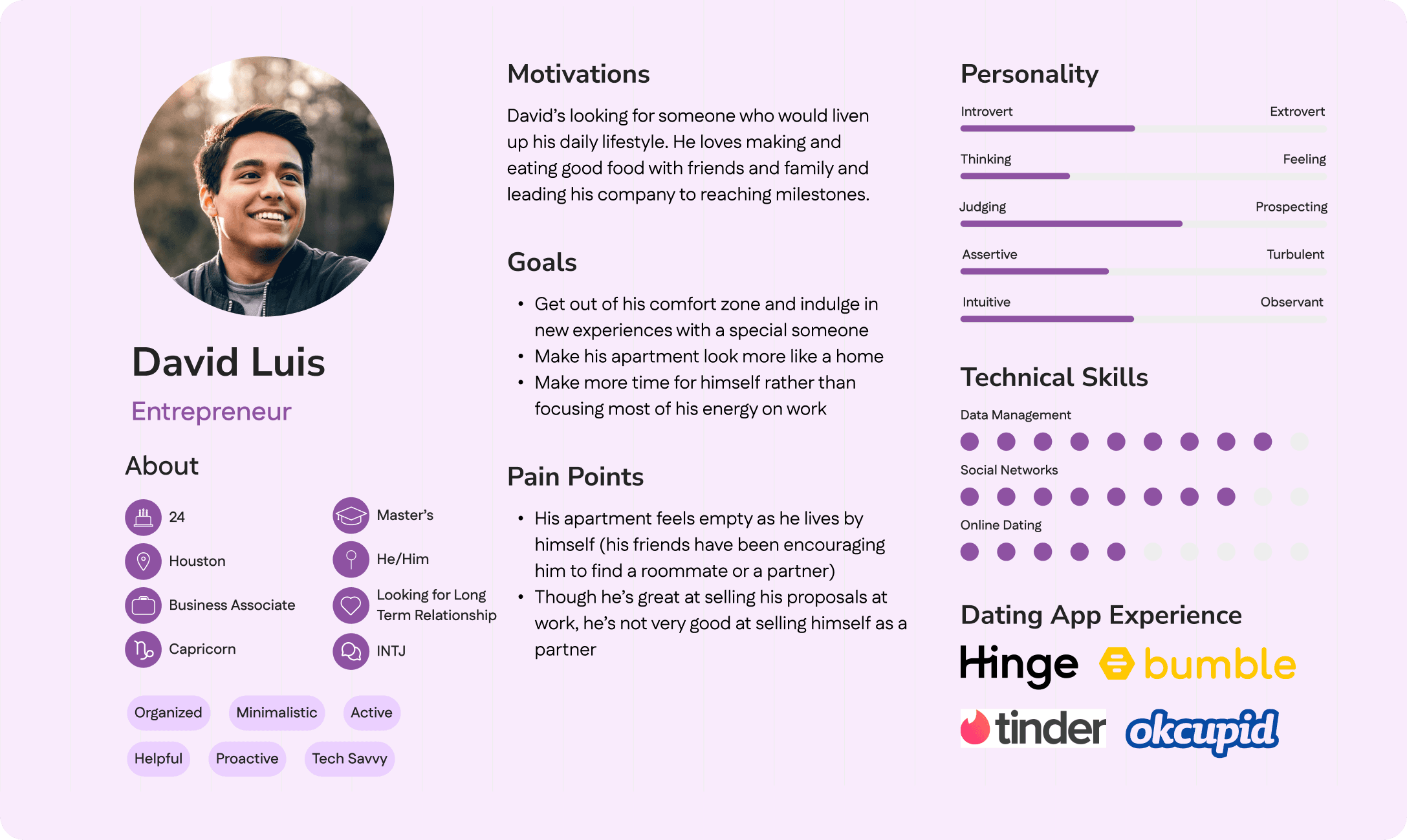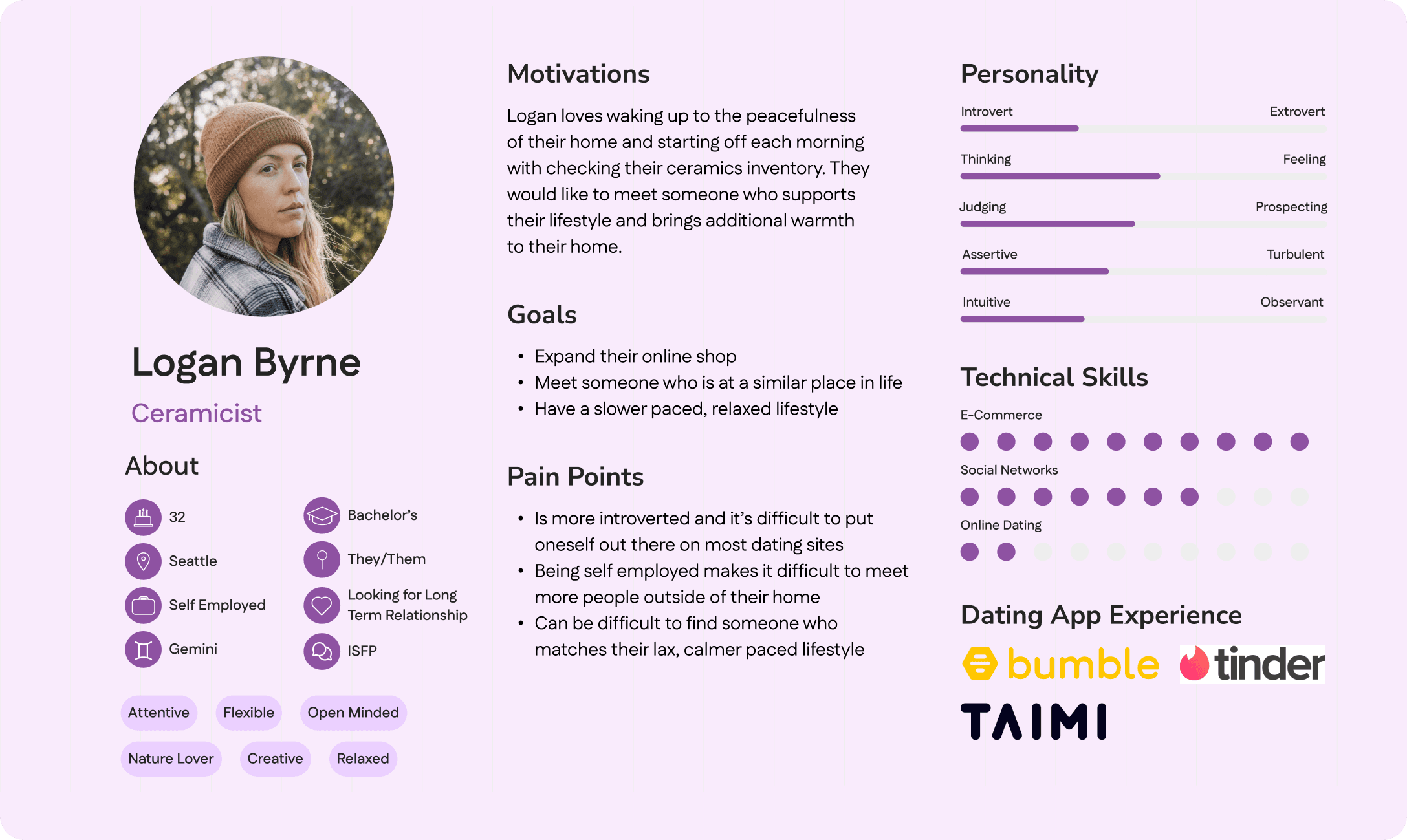 Based on our research, we created three user personas reflecting user concerns about safety, conversation struggles, and partner commitment.