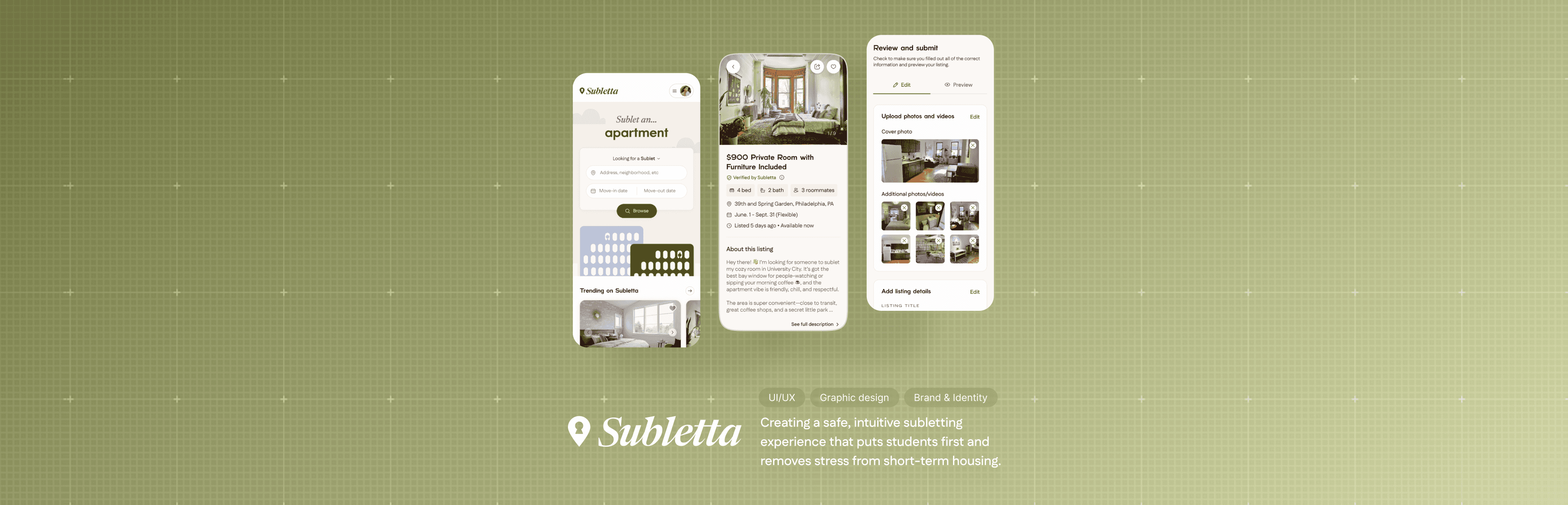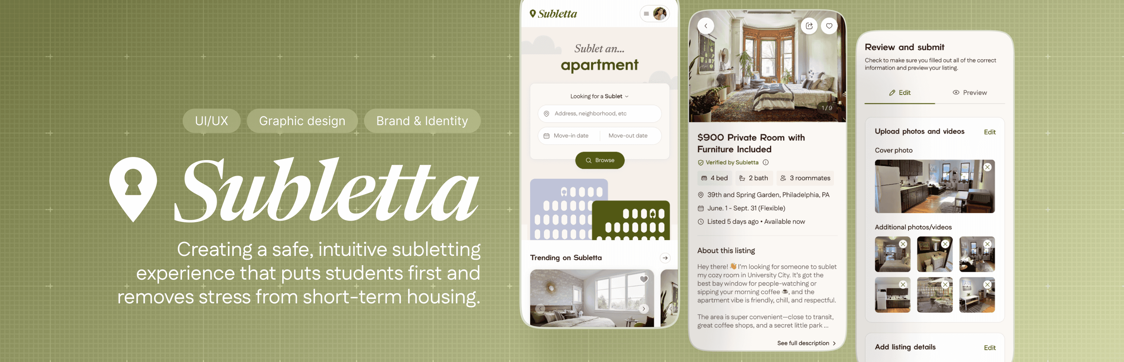 Subletta is a web platform that makes subletting safer and simpler for students and young adults through a guided experience, strong user verification, and personalized search tools.